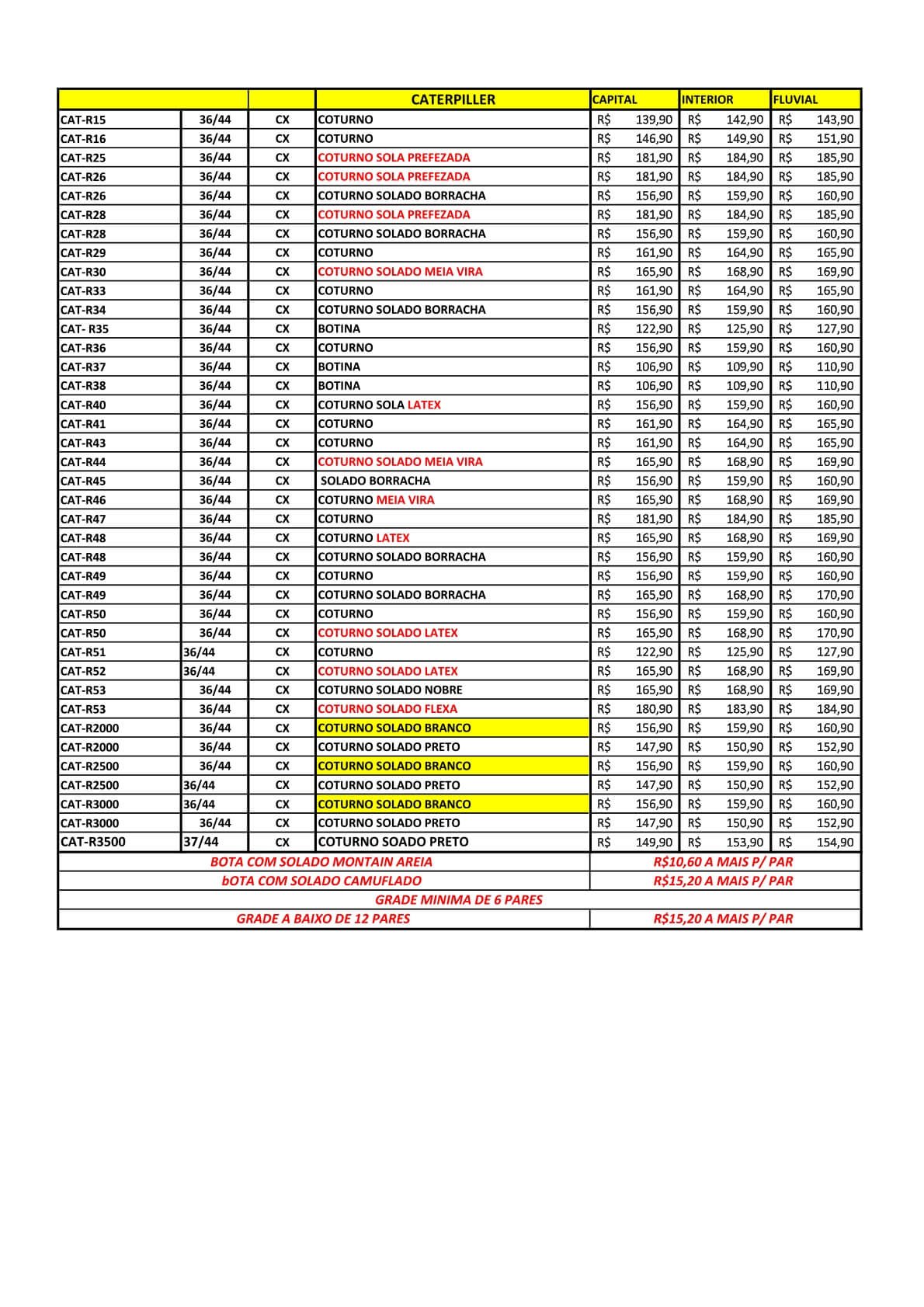 FAVOR ESPECIFICAR SE HOUVER, CUSTOS ADICIONAIS NO CAMPO "OBSERVAÇÕES; ESPECIFICAR DESCRIÇÃO COMPLETA DO SOLADO (MATERIAL, MODELO E COR)
